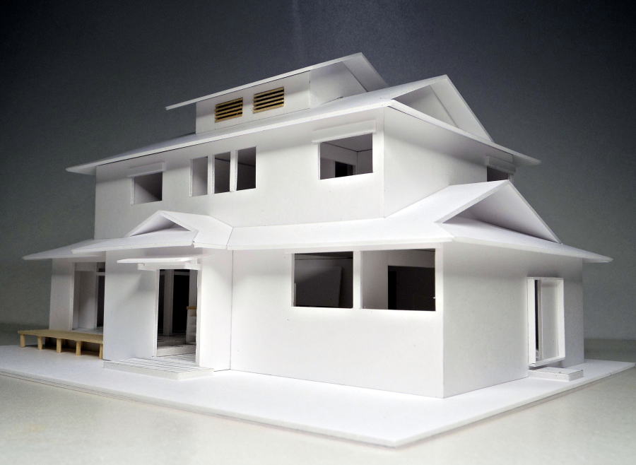 換気機能の越屋根付きの入母屋屋根、和室欄間、屋根裏収納の模型