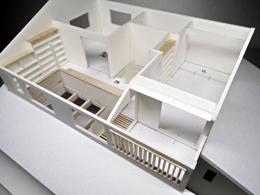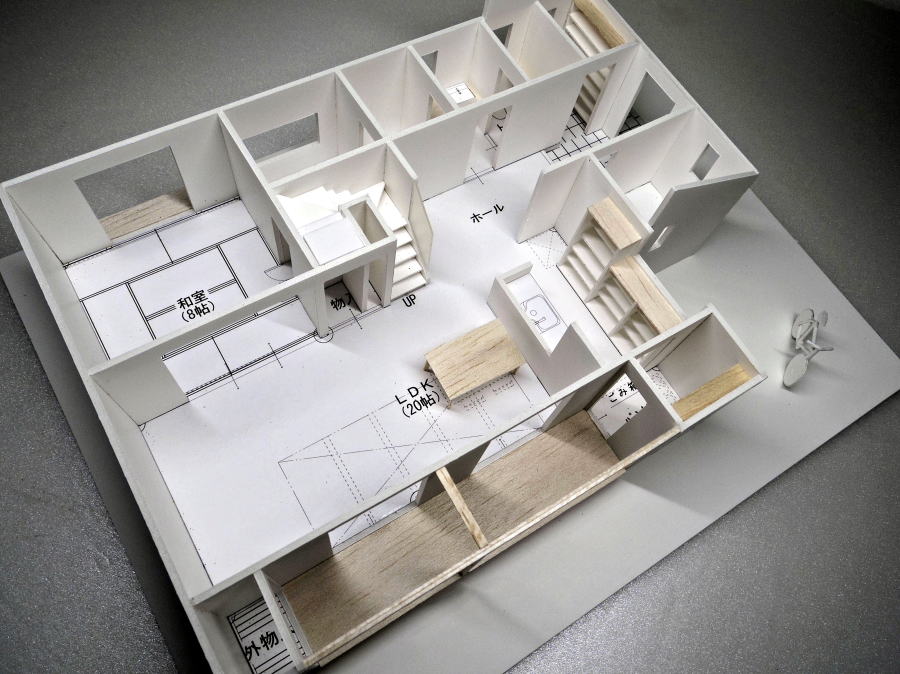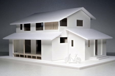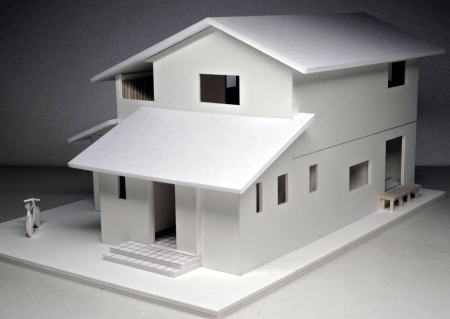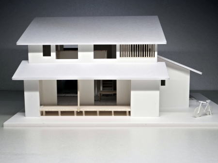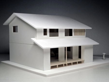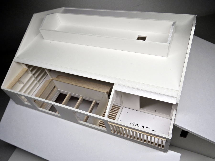 切妻屋根、目隠し縦格子、吹抜け すのこ床の模型