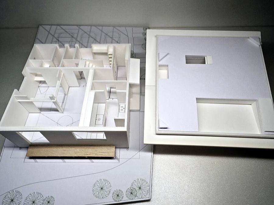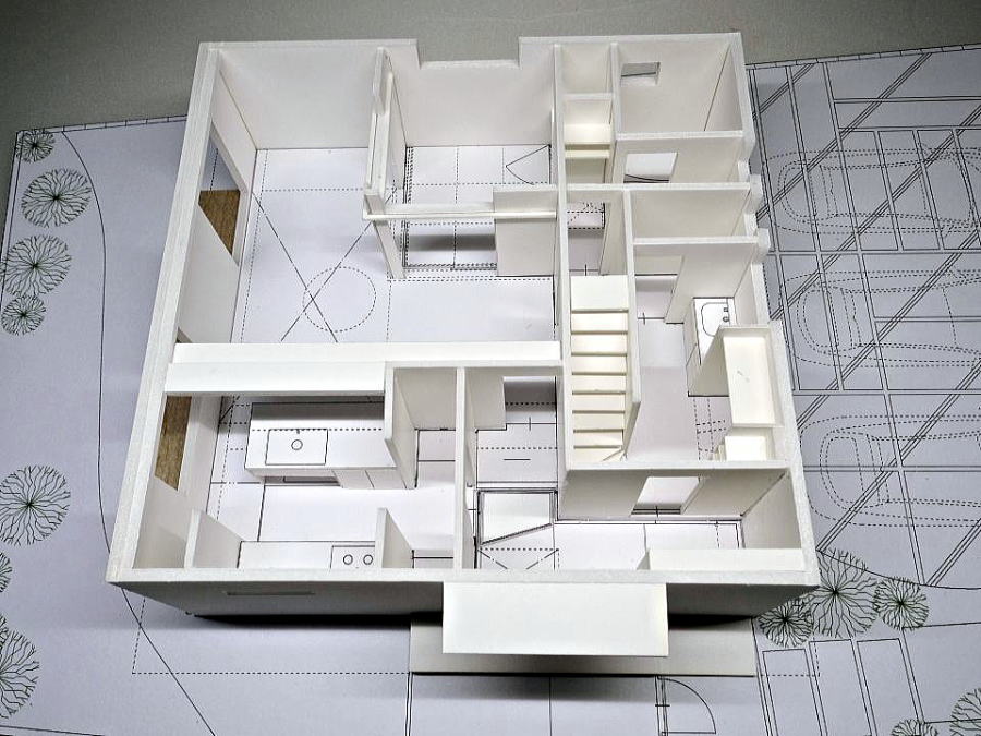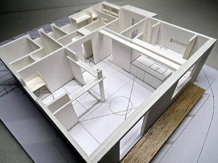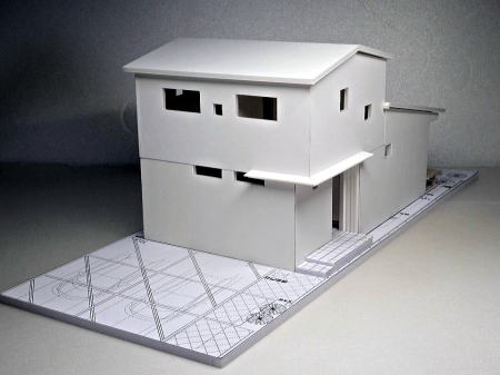 <建築模型の写真>S=1:50 玄関の明るい工夫して居間に勾配天井のある住宅模型 へのリンク