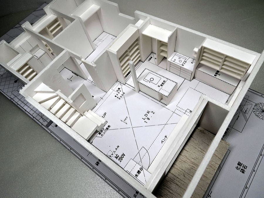 勾配天井、中2階の吹抜け大空間の模型