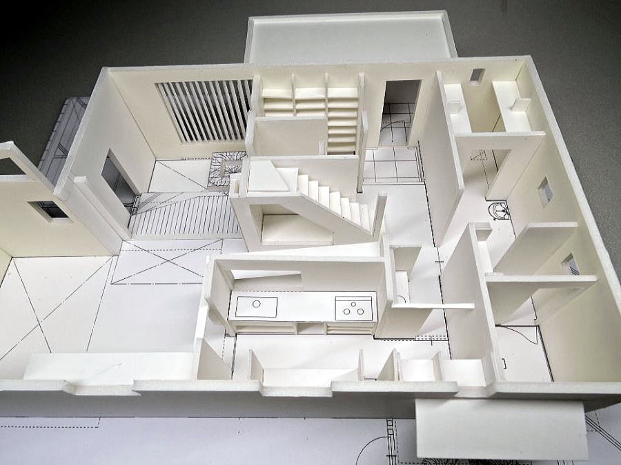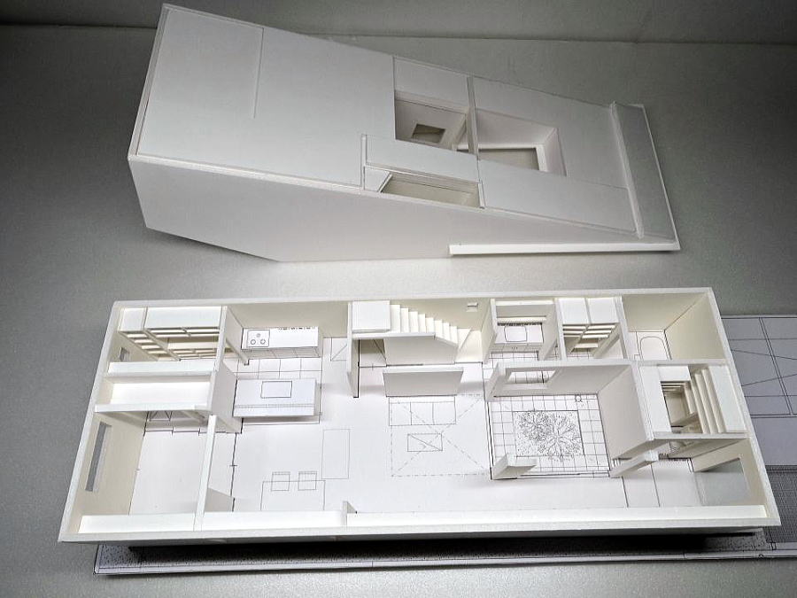 <建築模型の写真>1:50 中庭、吹き抜け空間、家事収納の模型 へのリンク