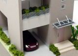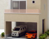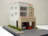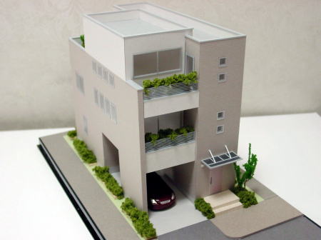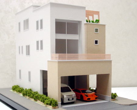 狭小の間口の3階建ての住宅模型です。左のプランの玄関は二台の車の後ろの奥に設けてあります。