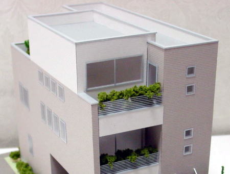 弊社の外観模型は窓越しに奥の窓が透けて見えますので開放感のある明るい模型です。